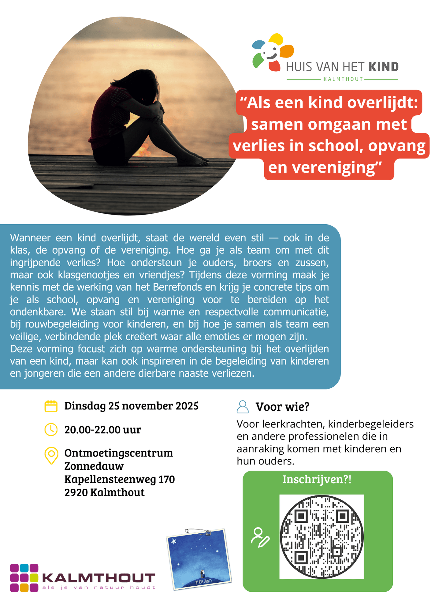 Tijdens deze vorming maak je kennis met de werking van het Berrefonds en krijg je concrete tips om je als school, opvang en vereniging voor te bereiden op het ondenkbare. We staan stil bij warme en respectvolle communicatie, bij rouwbegeleiding voor kinderen, en bij hoe je samen als team een veilige, verbindende plek creëert waar alle emoties er mogen zijn.