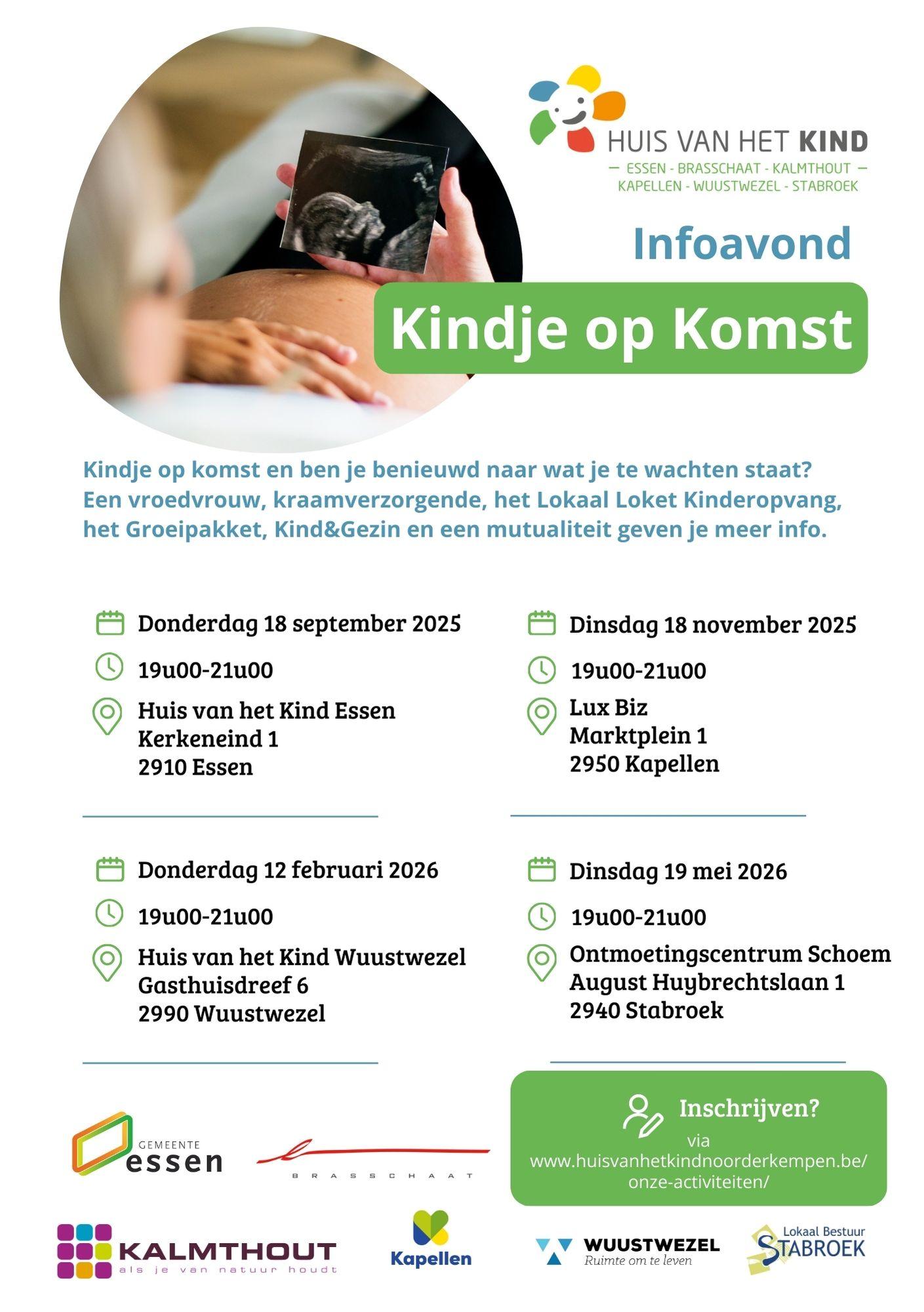 Tijdens de infoavond "Kindje op Komst" krijg je een antwoord op al je vragen, twijfels en bezorgdheden. Verschillende organisaties (vroedvrouw, kraamzorg, Groeipakket, Kind&Gezin en mutualiteit) zijn aanwezig om je meer informatie te geven over alle fasen van de zwangerschap tot de geboorte.