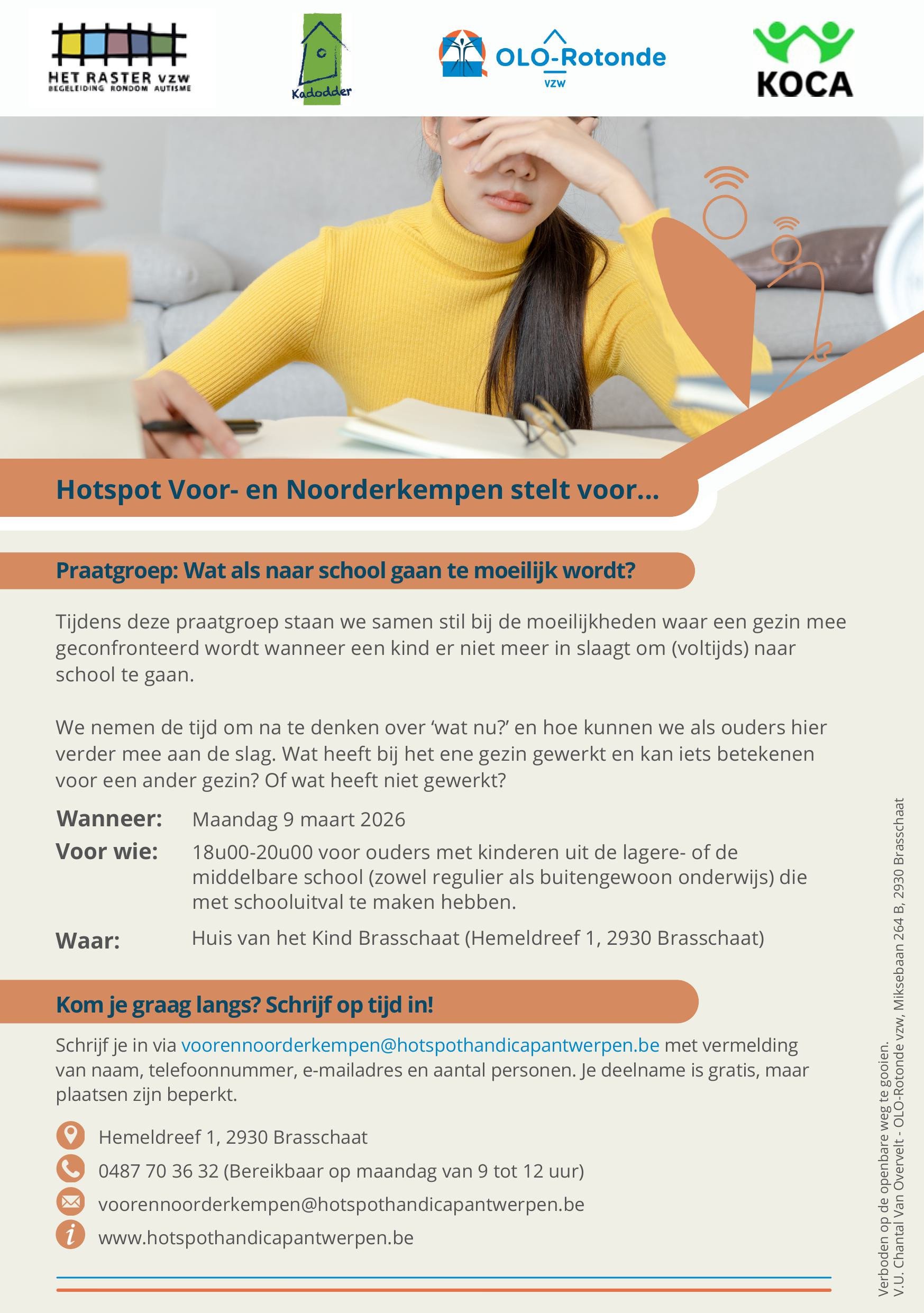 Tijdens deze praatgroep staan we samen stil bij de moeilijkheden waar een gezin mee geconfronteerd wordt, wanneer een kind er niet meer in slaagt om (voltijds) naar school te gaan.