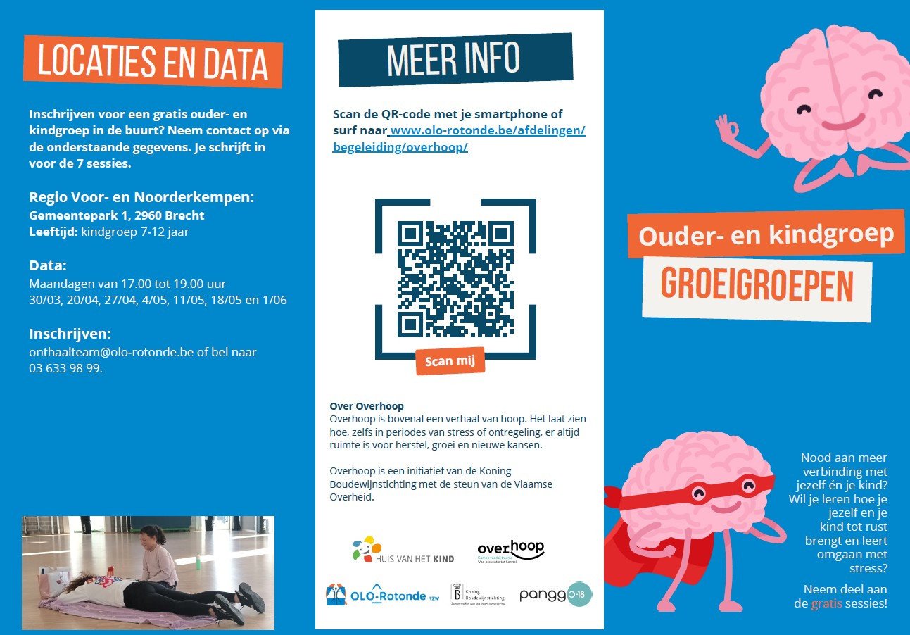 OverHoop organiseert laagdrempelige, gratis groepssessies voor ouders en kinderen. Tijdens de sessies helpen we met stressregulatie, leren voelen wat er in jouw lichaam gebeurt, spanning en stress leren herkennen en hoe deze te communiceren.